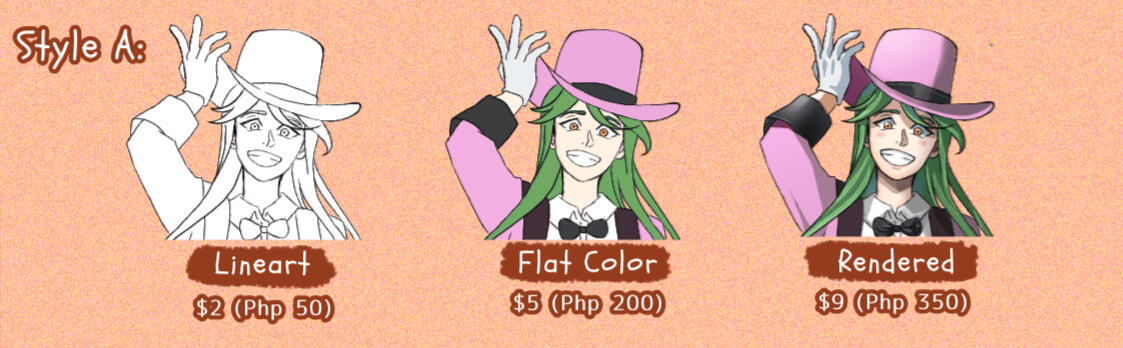 For rendering: Style A will be drawn using the prepared rough sketch, then a fine lineart, with only minimum color blending.