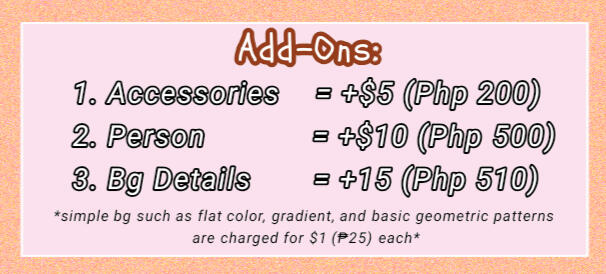 Complex background scenery details requires specific information (colors, size, shape of the object), and costs $15 (₱510) per item.